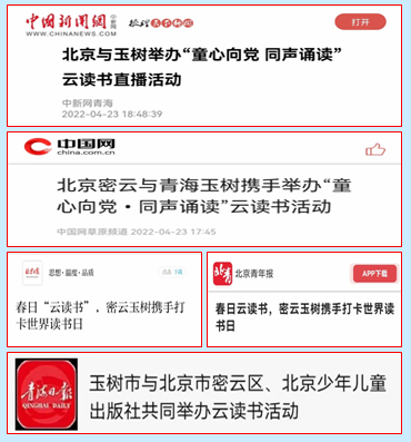 活动举办后,新华社、人民网、央广网、光明网、中国新闻网、中国网、北京日报、青海日报、三江源报、玉树市融媒体中心等20余家媒体报刊进行了集中报道。近三天中,云读书活动在新华社报道的浏览量达22万次以上,在“宜居密云”微博直播的播放量达10万次以上,各类媒体累计播放量达40余万次。