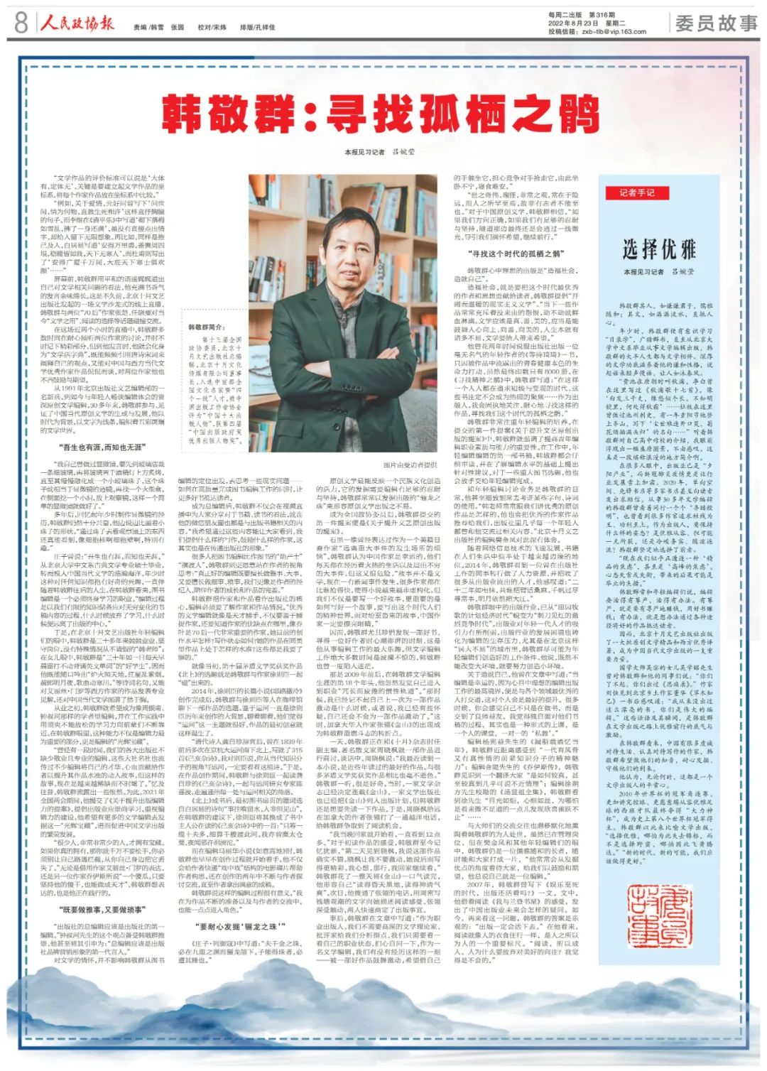 很多人把图书编辑比作图书的“助产士”“摆渡人”,韩敬群则更愿意站在作者的视角思考:“真正好的编辑既要擅长做雅事、大事,又要擅长做细事、琐事。我们更像是作者的经纪人,陪伴作者的成长和作品的完善。”