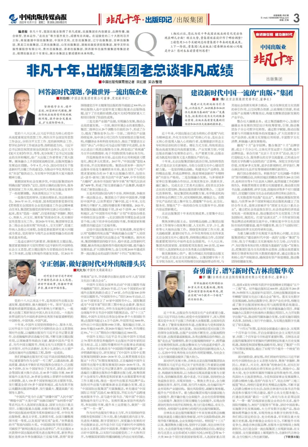非凡十年,我国出版业取得了非凡成就,出版集团在内容建设、品牌传播、融合转型、资本运作、“走出去”等方面齐发力,成绩有目共睹。在迎接党的二十大胜利召开之际,商报邀请中国出版集团、中国外文局、北京出版集团、辽宁出版集团、吉林出版集团、黑龙江出版集团、江西出版集团、山东出版集团、湖南出版投资控股集团、新华文轩出版传媒股份有限公司、贵州出版集团、读者出版集团、陕西新华出版传媒集团等集团老总,梳理出版业近十年变化,展示各集团主要成绩和未来构想。