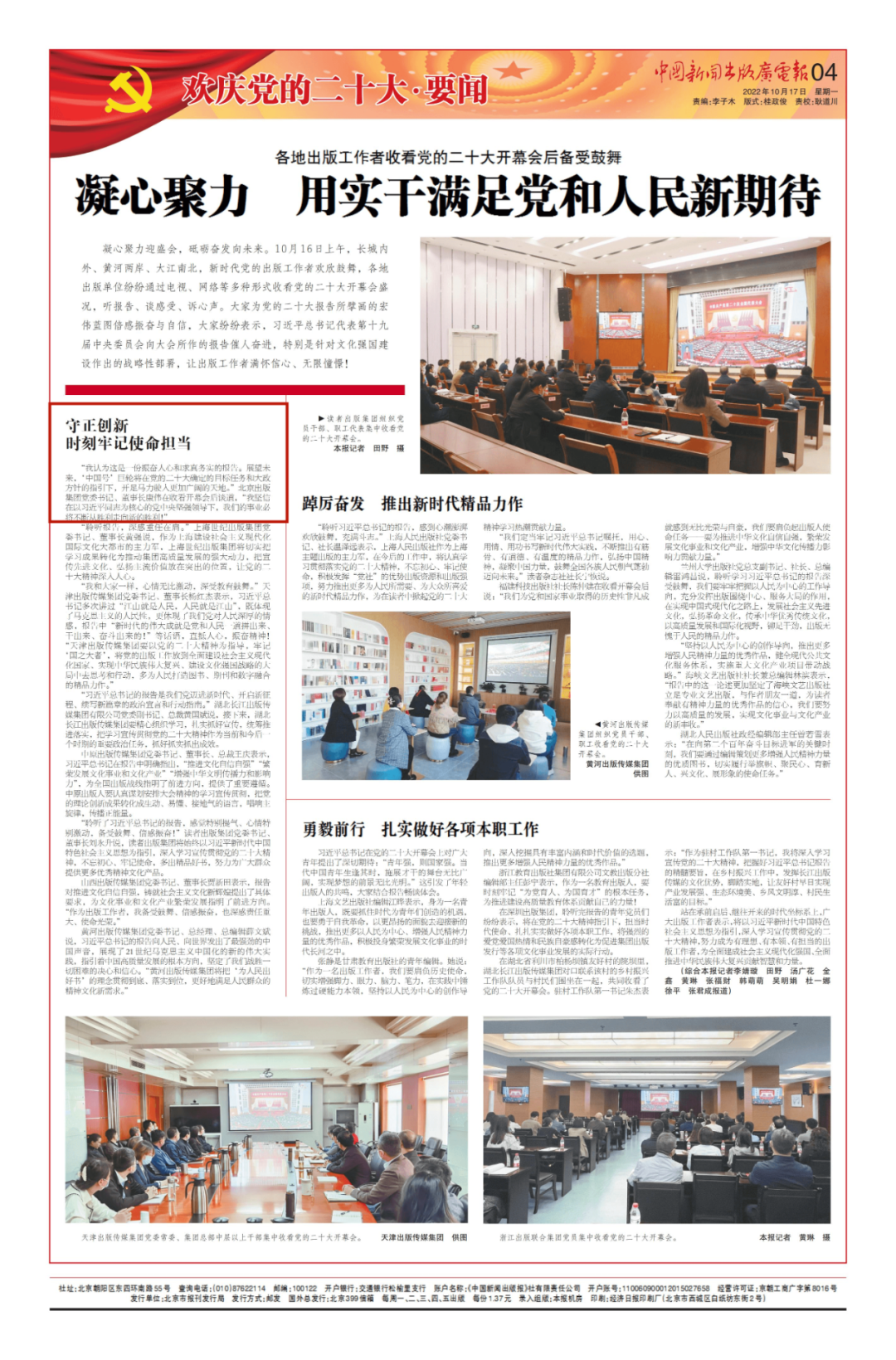10月17日,《中国新闻出版广电报》04版刊发了题为《凝心聚力 用实干满足党和人民新期待》一文。文章刊登了北京出版集团党委书记、董事长康伟收看党的二十大开幕会感想。