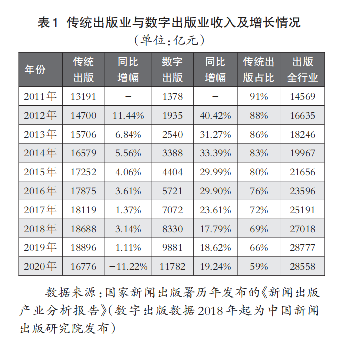 与传统出版产业的衰退情况大不相同,数字出版行业表现得蒸蒸日上、欣欣向荣。2012年数字出版行业增长高达40.4%,随后在2013~2016年始终保持30%左右的高速增长。直到2019年,增长速度一直高于15%。2020年暴发新冠疫情,增速为19.2%,高于2019年的18.6%。2011~2020年,数字出版行业收入的平均复合增长率为26.93%,表现出持续强劲的增长势头(见表1)。