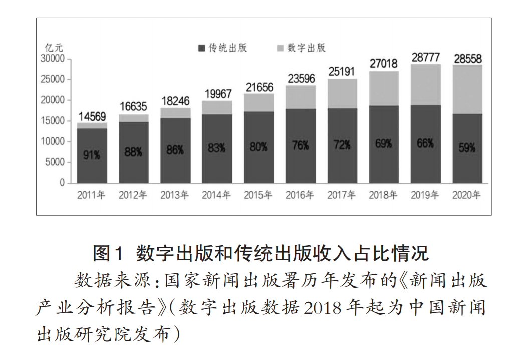 体现在出版行业整体销售构成上,数字出版占比节节攀升,而传统出版份额却不断被挤占。2011年,传统出版销售收入占比还高达91%,但逐年降低,2019年仅占66%,2021年占比进一步下降为59%。数字出版占比却从2011年的9%,一路高歌猛进,2020达到41%,在短短10年时间内,数字出版产业的行业销售占比已接近半壁江山(见图1)。
