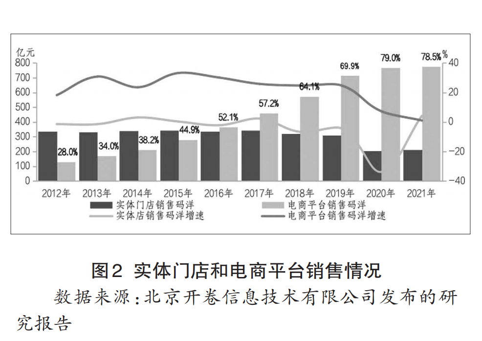 同时电商销售占比不断扩大,成为图书销售主渠道。2012年,电商平台的销售码洋占比不足30%。之后每年平均保持25%以上的增速,2016年电商平台销售码洋首次超过实体门店,占比达到52%。2021年其占比进一步提升到78.5%,电商平台已经牢牢占据了图书零售市场主渠道地位(见图2)。