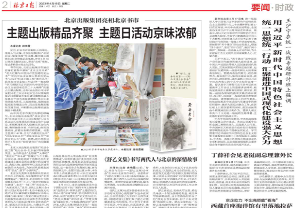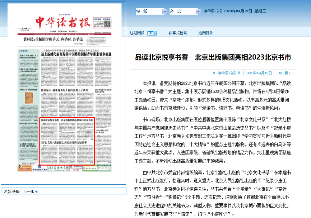 在北京市委宣传部、书市组委会组织协调下,各级领导大力支持推进下,新华社、人民日报(客户端)、光明日报、北京日报、北京广播电视台、中国新闻出版广电报等20余家主流中央、市属、行业媒体围绕集团参展2023北京书市、举办“世界读书日”系列活动、多种产品荣获大奖及“北京文化书系”、《瓦屋山桑》、《天鹅荡》、《老龄知识百问百答》等新品佳作面世,刊发首发报道近百篇。