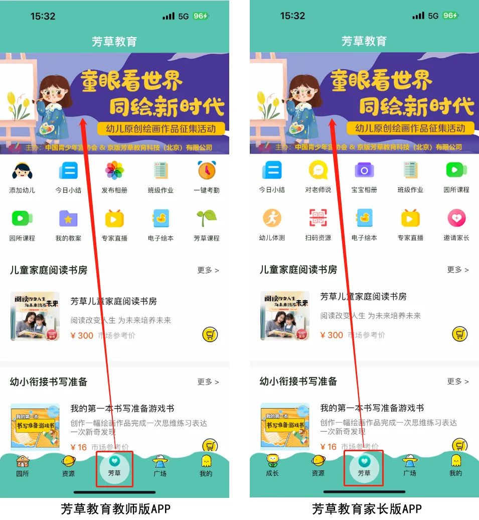 1.用户登录京版芳草教育教师版或家长版APP首页,找到“童眼看世界 同绘新时代”作品征集栏目;