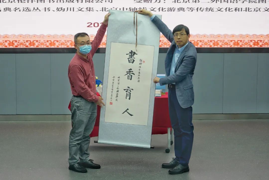 北二外文化与传播学院李洪波院长回赠学生创作的“书香育人”书法作品,感谢北京出版集团对二外人才培养、学风建设、文化育人的大力支持。
