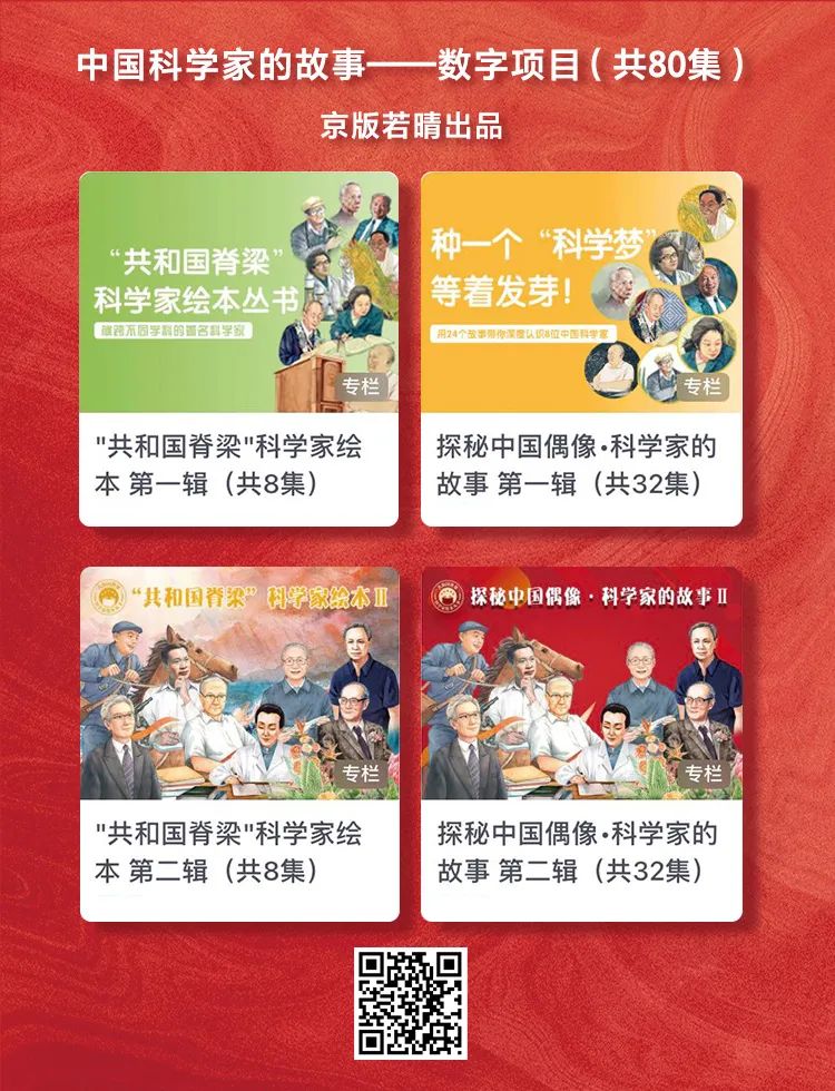 “中国科学家的故事——数字项目(共80集)”是基于集团京版若晴科创文化发展(北京)有限公司出版的重点图书“‘共和国脊梁’科学家绘本丛书”改编并拓展延伸而成的音频故事系列专辑,入选国家新闻出版署“出版融合发展工程2021年度数字出版精品遴选推荐计划"。2022年作为数字出版精品项目在首届全民阅读大会数字阅读体验馆特设的数字阅读成果展进行展示。该项目由资深数字产品制作人策划,资深编辑进行编校,电台主持人、阅读推广人倾情朗读,较好地呈现了音频的故事性。该项目音频故事目前已在京版若晴自有平台小鹅通,及喜马拉雅FM、口袋故事等30余个合作平台上上线,累计播放上亿次。
