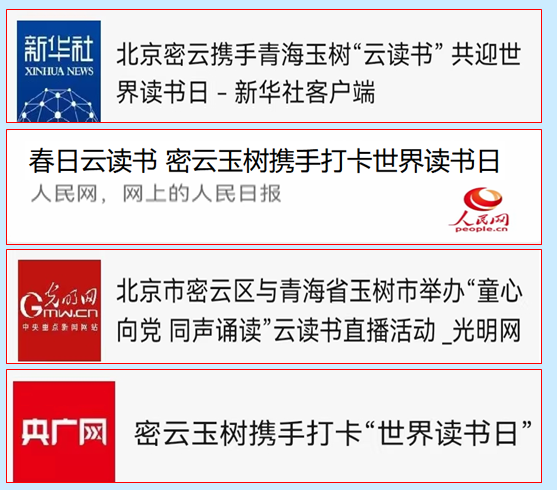活动举办后,新华社、人民网、央广网、光明网、中国新闻网、中国网、北京日报、青海日报、三江源报、玉树市融媒体中心等20余家媒体报刊进行了集中报道。近三天中,云读书活动在新华社报道的浏览量达22万次以上,在“宜居密云”微博直播的播放量达10万次以上,各类媒体累计播放量达40余万次。