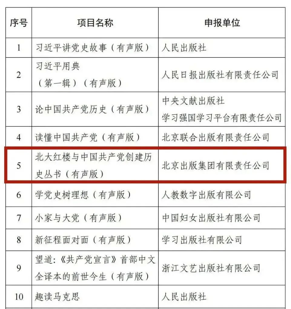 近日,国家新闻出版署公布2022年全国有声读物精品出版工程入选项目,北京出版集团策划出品的“北大红楼与中国共产党创建历史”丛书(有声版)入选,这是集团有声产品首次入选该工程。项目的成功入选,是集团一直以来坚持精品战略,积极尝试运用新兴数字技术,扶持传统优质出版内容与新兴应用场景有机融合的成功案例,体现了集团近年来积极构建以“出版+”为新增长点,努力转型成为以文化服务、知识服务为引领的文化产业运营商的有益实践,是积极探索推动集团转型升级发展的又一次新突破。