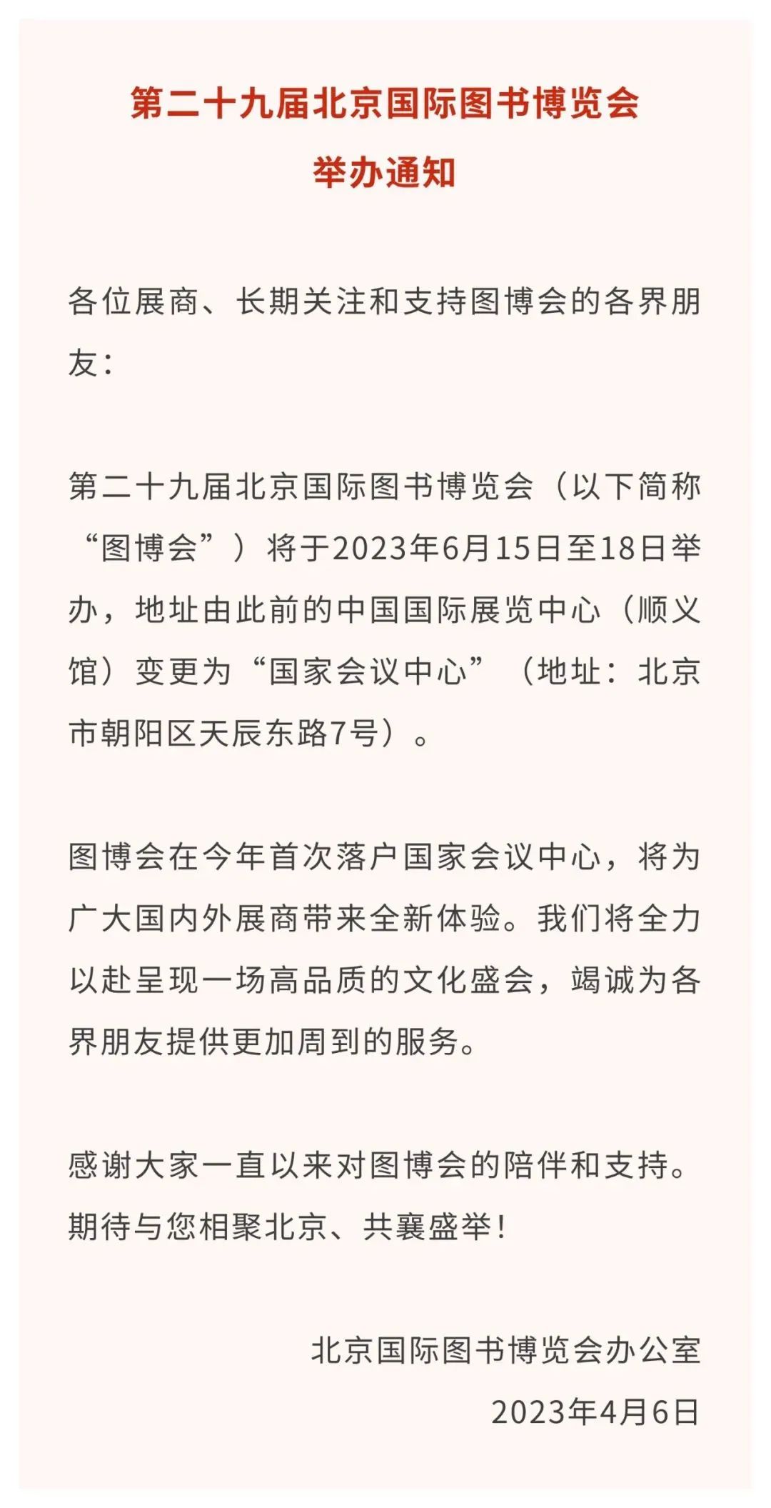 近日,北京国际图书博览会办公室发布通知,第二十九届北京国际图书博览会将首次落户国家会议中心(北京市朝阳区天辰东路7号),于6月15日至18日举办。