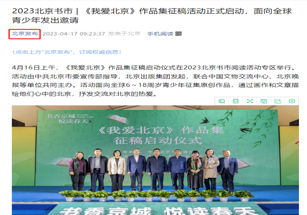 4月16日,集团在北京书市现场正式启动《我爱北京》作品集征稿活动,面向全球青少年发出抒写新时代北京故事的诚挚邀请。