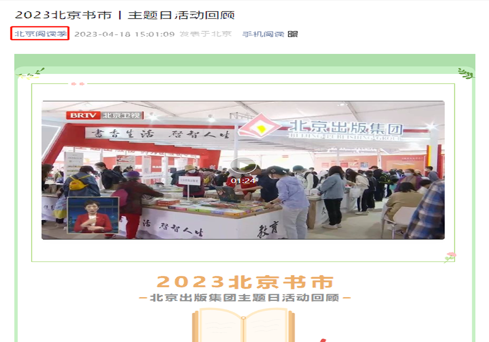 在北京市委宣传部、书市组委会组织协调下,各级领导大力支持推进下,新华社、人民日报(客户端)、光明日报、北京日报、北京广播电视台、中国新闻出版广电报等20余家主流中央、市属、行业媒体围绕集团参展2023北京书市、举办“世界读书日”系列活动、多种产品荣获大奖及“北京文化书系”、《瓦屋山桑》、《天鹅荡》、《老龄知识百问百答》等新品佳作面世,刊发首发报道近百篇。