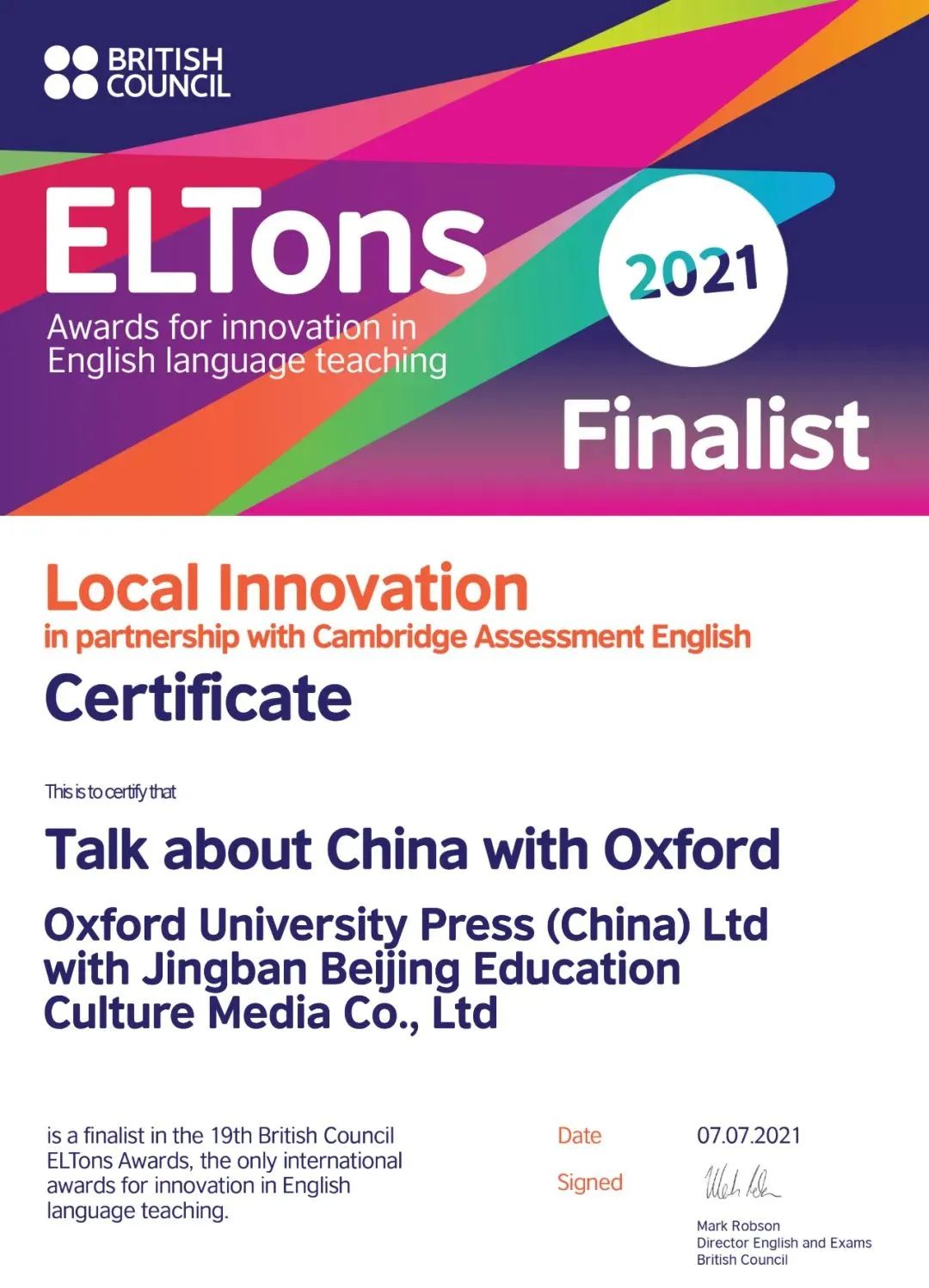 2021年7月,“牛津英语话中国”系列图书从来自全球50个国家和地区的180多个项目中脱颖而出,荣获ELTons国际英语教学创新奖2021年度本土教学创新奖提名奖。该奖项被称为“国际英语教学界的奥斯卡奖”,此次获奖是中国出版界首次荣获该奖项。2022年,该系列丛书中的部分图书入选教育部全国中小学图书馆(室)推荐书目。
