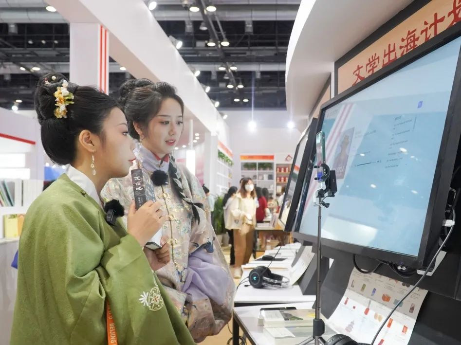 图博会期间,集团线上、线下举办圆桌对谈、文化讲座以及新书发布会等多场精彩文化活动;同时还在展会现场进行中英双语直播探展,工作人员身着汉服为各国线上客商、读者介绍集团新书好书,讲述作品背后的中国故事。