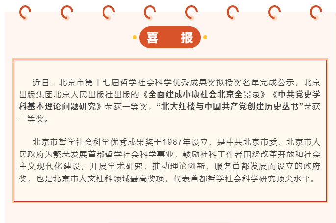 近日,北京市第十七届哲学社会科学优秀成果奖拟授奖名单完成公示,北京出版集团北京人民出版社出版的《全面建成小康社会北京全景录》《中共党史学科基本理论问题研究》荣获一等奖,“北大红楼与中国共产党创建历史丛...